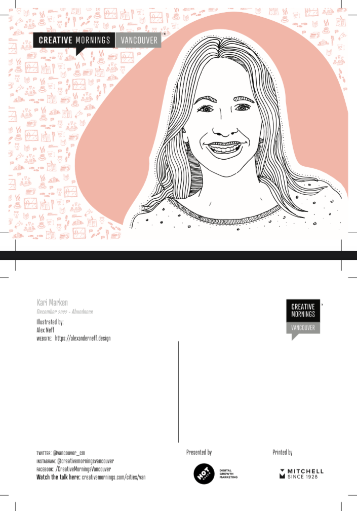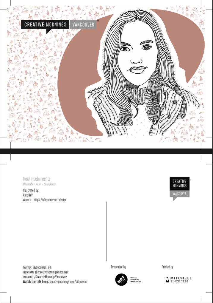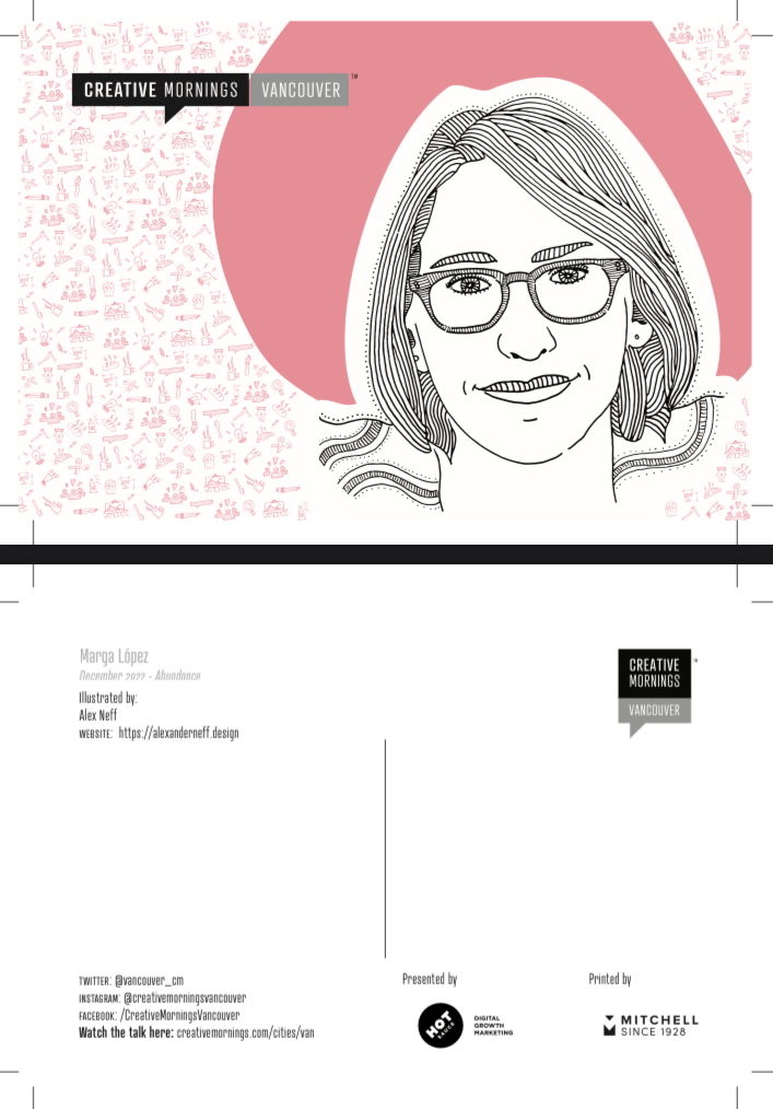 Working with CreativeMornings/Vancouver has been an integral part of my career. I was presented with many fun opportunities over my six years of volunteering, beginning with door support, then hosting FieldTrips and talks, being a speaker myself, and later becoming the musical guest coordinator. For this signature role, I brought my personal touch by creating unique pieces for each musician, band, and ensemble that joined us to recognize their contributions to creating a safe and engaging space for our community. It was an honour to hold space for the inherent gifts of others, while sharing my own.
