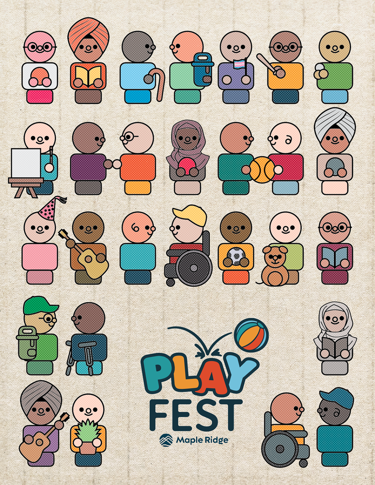This project brought out the kid in me. In creating the concept for the poster and community mural for PLAYfest at Albion Community Centre, I thought back to the wooden dolls that were once my Nana's, passed down to my Mum, passed down to me and my siblings. I thought "what if any kid could see themselves in one of these dolls?" and I went to work creating the most diverse array of wooden dolls I could, that way, when kids came to participate in the mural making, they could select a panel that they see themselves in. It was a huge success and 150 children created artwork for Albion Community Centre. It was very special to have my Mum there alongside me at the event, connecting once again over those nostalgic dolls of our childhood.